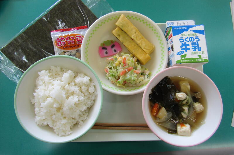 2月3日(火) 本日の給食は、酢飯・のり・とうふのすまし汁・ちぐさやき・ツナサラダ・せつぶんまめ・牛乳でした。