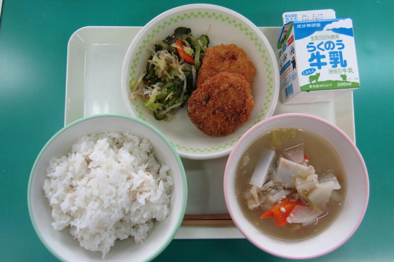 2月10日(月) 本日の給食は、キムタクご飯、ふしそうめんのみそ汁、ひじきぎょうざ、ポテトサラダ、牛乳でした。