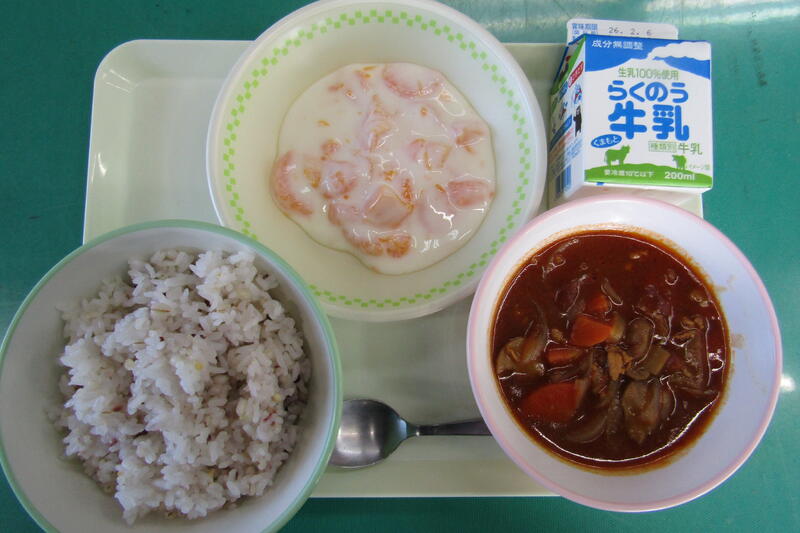 ハヤシルーは、なめらかで、コクがあって子どもたちも喜んでいただいていました。とてもおいしかったです。フルーツヨーグルトは人気のメニューです。みかんとももが入っていて、子どもたちが大好きな味でした。今日もおいしくいただきました。ありがとうございました。ごちそうさまでした!