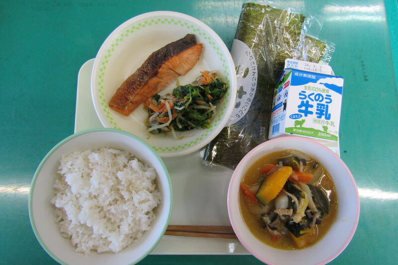 1月26日(月) 本日の給食は、セルフおにぎり、えいようみそ汁、サケの塩焼き、のり、ほうれん草の和え物、牛乳でした。