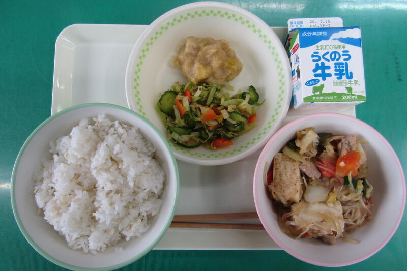 熊本県はトマトの生産量が全国1位です「トマトパン」には、八代の「はちべえトマト」を使ってありますが、玉名でもおいしいトマトがたくさん作られています。タイピーエンは、もともと中国福建省の郷土料理です。中国では、高級食材のツバメの巣を使うそうです。熊本では、それによく似た春雨を使います。「馬かコロッケ」は、熊本市の小学生が考えたコロッケです。熊本は馬肉が有名なので、馬の肉を使い、子どもたちが好きなカレー味にしたそうです。熊本は、縄文時代から大豆が作られていたようです。給食では、大豆を使った「豆まめサラダ」を作ってくださいました。私は、豆類が大好きなのですが、子どもたちの中には食べ慣れず、一粒ずつ食べている子どももいました。栄養豊かな豆類。好きになってほしいですね。今日もおいしくいただきました。ありがとうございました。ごちそうさまでした!