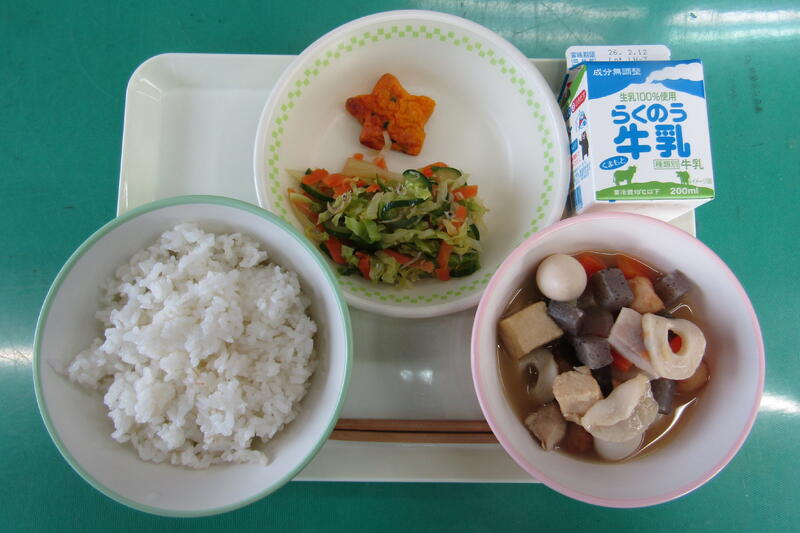 1月29日(木) 本日の給食は、麦ご飯、ひめじおでん、豆乳五目しんじょ、じゃこあえ、牛乳でした。