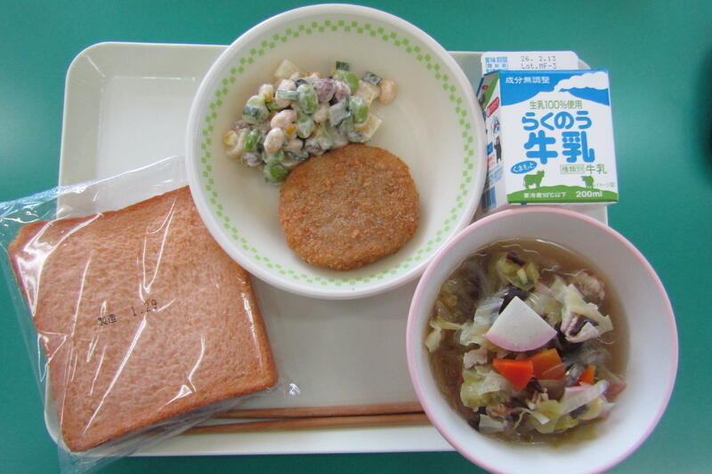 1月30日(金) 本日の給食は、トマトパン、うまかコロッケ(馬かコロッケ)、タイピーエン、豆まめサラダ、牛乳でした。