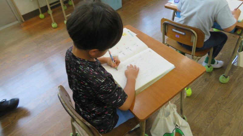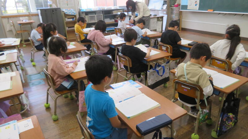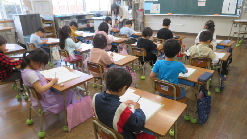 1年生・2年生は、大里先生に硬筆を教えていただきました。はねるところ、払うところ、止めるところ、○や、の大きさや書く場所など、書くときのポイントを具体的に実物投影機を使いながら、教えていただきました。そのあとに自分たちで書きます。教えていただいたように書けずに、何度も消して書く直す子ども。お手本の文字を何度も見て慎重に書く子ども。みんなが真剣に書き初めの課題に挑戦しました。先生も見て回って、「ここをはねるといいですよ。」「ここは、しっかり止めましょう。」などとアドバイスをしてくださいました。大里先生に声をかけていただき、みんな、ますますやる気がでているようでした。1月にも書き初めの課題を書きます。更に上達して、堂々とした字が書けることでしょう。大里元校長先生、お忙しい中にご指導に来てくださいましてありがとうございました。