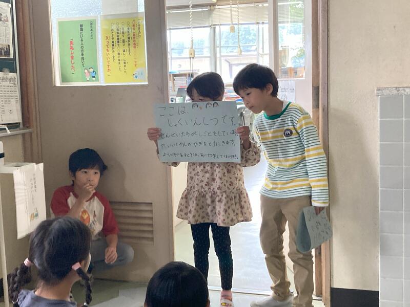 11月19日(水)に、2年生が手作り遊びコーナーを作り、1年生を招待してくれました。2年生は、1年生と昼休みに一緒に遊ぶ企画をよく考えてくれます。この日も、一緒に遊ぶゲームコーナーを数カ所用意して、一緒に遊んでくれました。これからも雨の日や寒い日など、外遊びができないときは誘ってくれるようです。1年生は、2年生にルールを教わりながら遊び、満面の笑みがこぼれていました。2年生は、それ以上に、優しい声で「こっちのおいで。こうゆう遊でだよ。」と話しかけ、1年生が楽しんでいる様子を見て、満足そうでした。いい交流の時間になっています。お互いに楽しく一緒の時間を過ごすことで、きずなも深まり、地域の仲間としての意識が育っているようです。