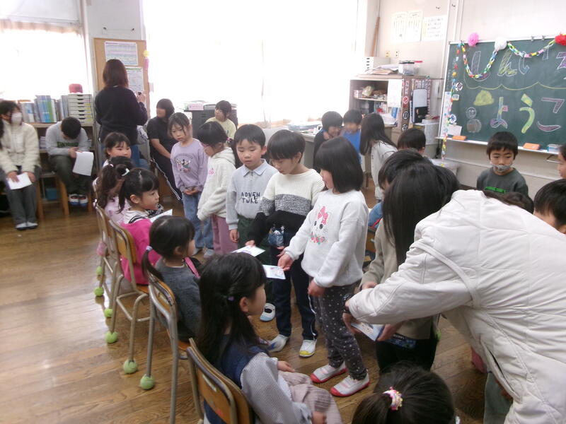 2月19日の新1年生の体験入学の時に、1年生は新1年生にアサガオの種のプレゼントをしました。自分たちが大事に育てたアサガオの種をプレゼントしました。新1年生は、四小での学校生活が楽しみになったり、四小のお兄さんとお姉さんの優しさにふれたりして、入学式後の生活を楽しみに思う気持ちが大きくなったのではないでしょうか。1年生や5年生だけでなく、四小のみんなが新しい1年生の入学を楽しみにしていますよ。その中でも特に、今の1年生は、来年2年生になり、新1年生にとって、お兄さんとお姉さんになります。新1年生に優しく教えてあげたいなあという気持ちでいっぱいです。みんなにとって4月がとても楽しみな日になりました。