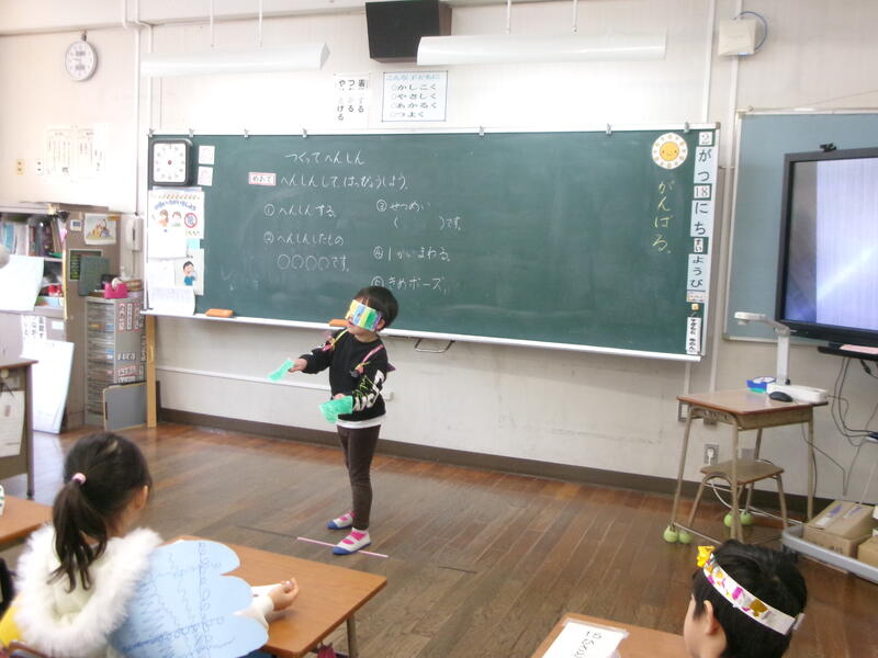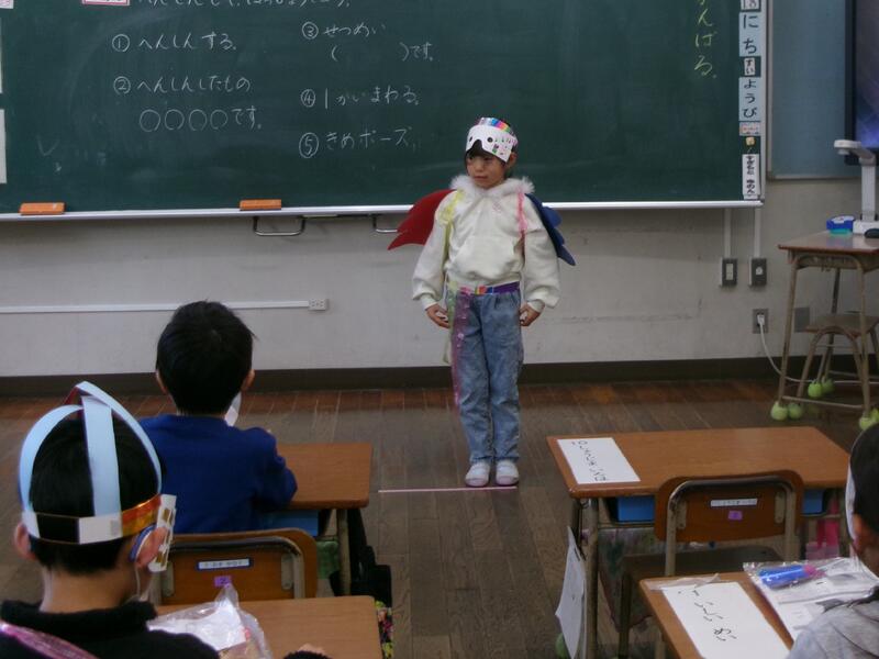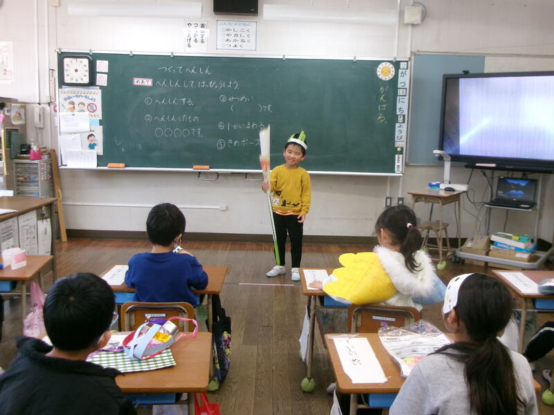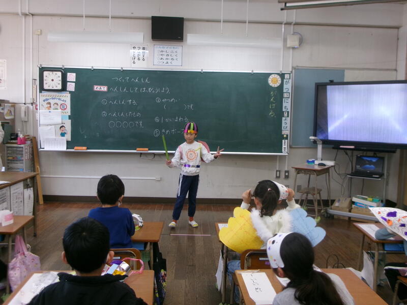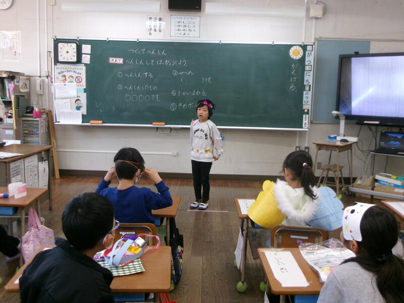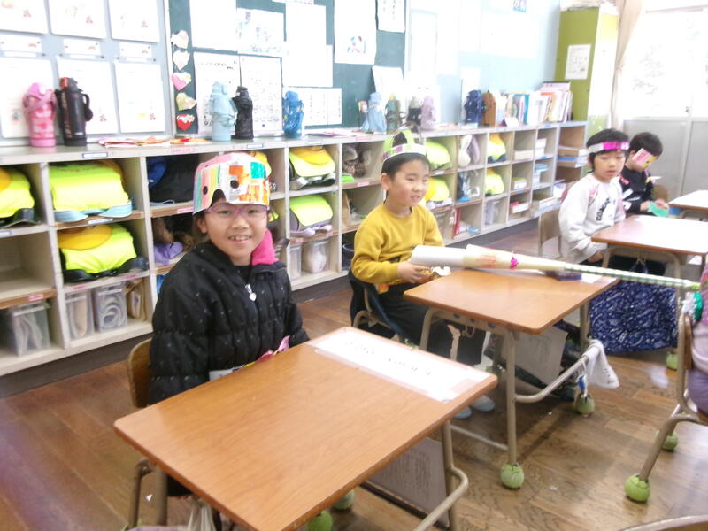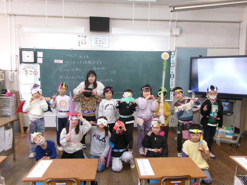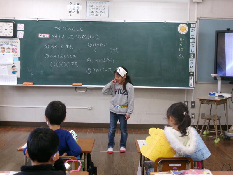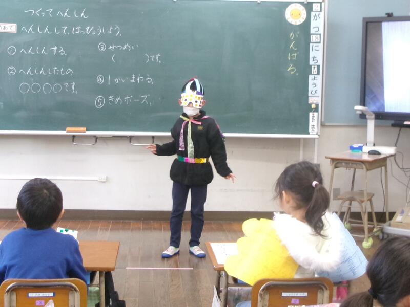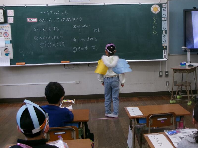 2月18日(水)に図工の「つくってへんしん」で作ったものを身につけて、発表会をしました。自分のつくりたい物、なりたい物、なりたい仕事などのテーマに合った衣装を作りました。それを身につけて、どのようなテーマだったのか、どこを頑張ったのかをみんなに発表しました。思い思いの衣装を身につけて発表する子どもたちは少し恥ずかしそうで嬉しそうでした。かっこいいポーズが決まっている子どももたくさんいました。子どもたちの夢のつまった楽しい発表会でした。