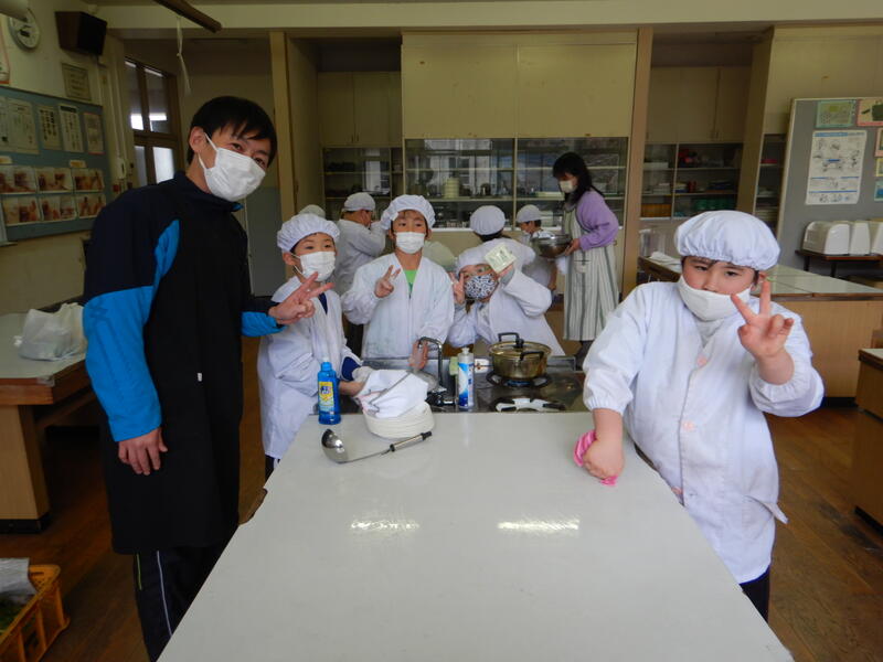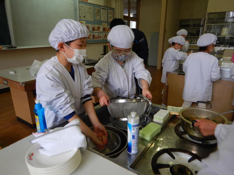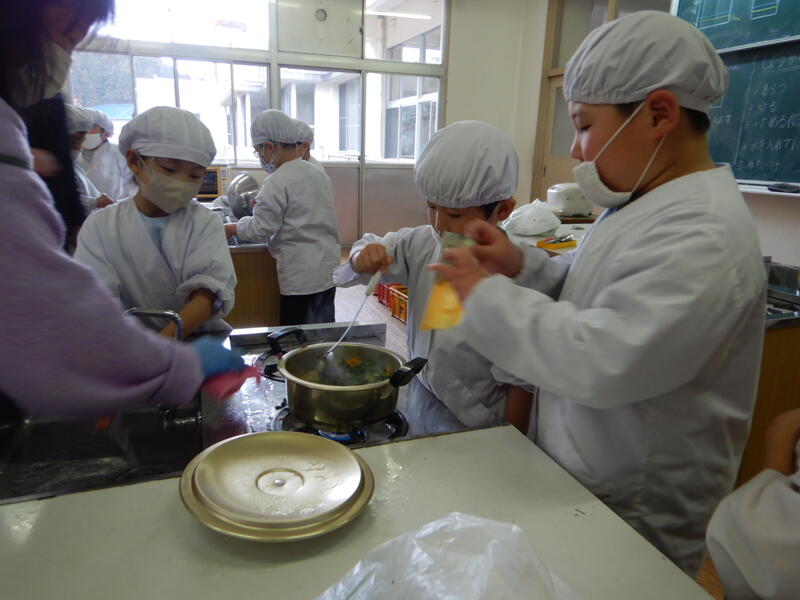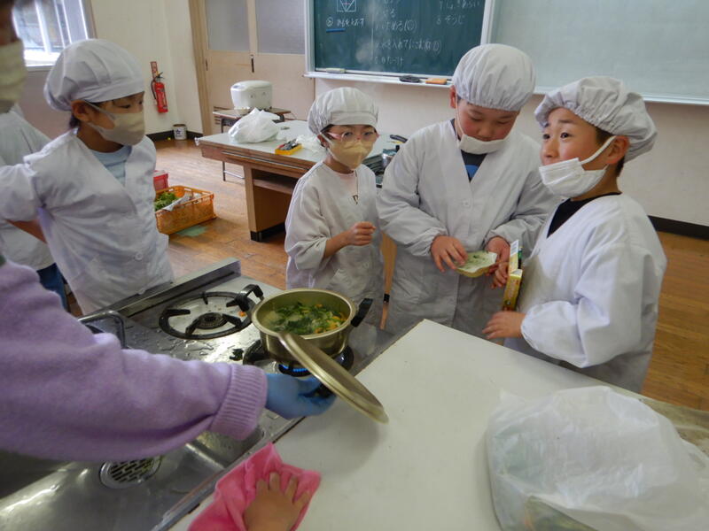 2月24日(火) 2年生は、生活科で作った野菜(にんじん、大根、ほうれん草)でカレーを作りました。家でも包丁を使ったことがない子どももたくさんいましたが、この日のために家で包丁の練習をして来た子どももいました。自分たちで育てた野菜入りのカレーはとてもおいしかったようです。おかわりをして、心も体も大満足でした。