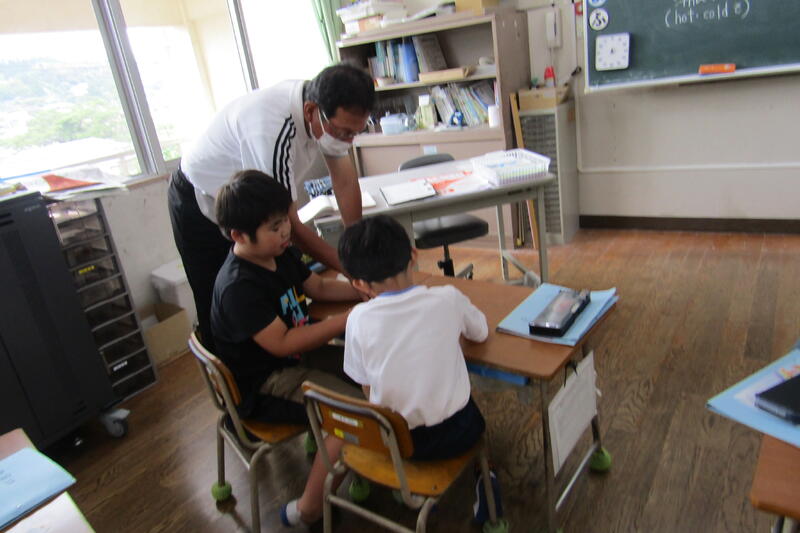 今日、4年生、2時間。3年生、2時間。習字の時間に大里先生に来ていただいて、ご指導をしてくださいました。子どもたちが書いている様子を見て、筆の向きや動かし方、姿勢などをアドバイスをくださったり、一緒に筆を持って筆の動きを導かれたりしていただきました。2時間ずつ各教室で一緒に習字の練習をしたら、みんな見違えるように堂々とした字が書けるようになりました。5年生、6年生も後日、ご指導していただきます。子どもたちのためのご指導。ありがとうございます!子どもたちも目に見えて上達するので、嬉しそうでした。
