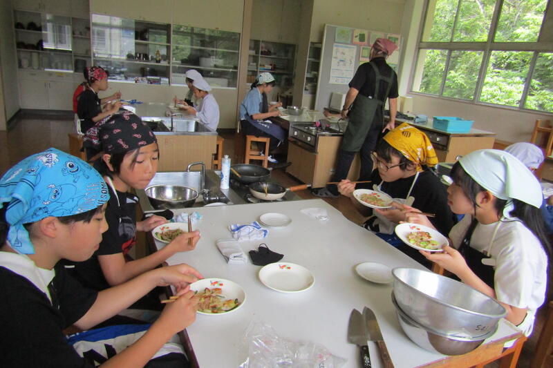 3時間目と4時間目に家庭科「朝食から健康な1日の生活を」の学習で調理実習をしました。班ごとに作る料理が違います。チーズやじゃがいも、えのきをベーコンに巻いてフライパンで焼いたり、チーズやベーコンの入ったオムレツを作ったり、じゃがいもを潰して、炒めたベーコンと混ぜて、丸めて、小麦粉を付け、チーズをのせて、フライパンで焼いたりした1品料理を調理しました。班ごとに作る料理が違ったので、チラチラ見ながら、家で他の班が作った料理にも挑戦したいなあと思いながら、実習をしていたようです。ベーコンを炒めるよい匂いが家庭科室周辺に広がっていました。美味しそうな料理ができあがりましたので、週末に家庭でも調理して家族を喜ばせてほしいです。
