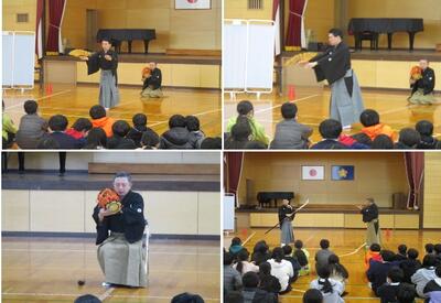 1月27日(金)の4校時、6年生の能楽鑑賞授業を行いました。観世流シテ方(主役)武田友志 様と大倉流小鼓方 飯富章宏 様にご来校いただき、子どもたちは本物を観ることができました。能楽の衣装や道具の話やそれぞれの役割、歴史的な話など、大変興味深い話や、小鼓に合わせて演技をしてしただきました。