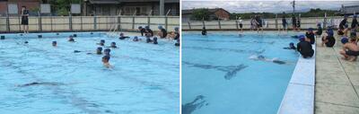 プールでの学習は、日常の生活空間と違うため楽しいさも増えますが、その分危険も増えると考えています。複数体制のでの指導、児童同士バディシステム等、安全に配慮することを第一に実施します。万が一の不測の事態に備えて、職員は毎年救急救命法を、学び続けています。