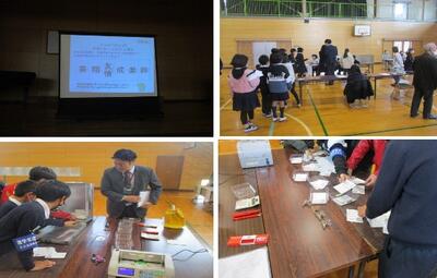 11月27日に6年生が選挙の出前講座を実施しました。合志市の選挙管理委員会の皆様に講師として来校いただき、実際の選挙と同じ手順で、卒業アルバムのタイトルを決める選挙を行いました。児童の各代表が、それぞれのタイトルに込めた思いを演説して、実際の選挙を行いました。選挙に参加するということは、自分の思いを反映させるために必要な事であること、また、自分の思いと同じものがなければ、自分が選ばれるために立候補するなど、選挙への関わり方を学ぶ事ができました。