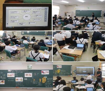 6年生は国語科「模型のまち」の授業でした。物語文に関して、これまで文中の表現の工夫を学んできました。繰り返しの言葉であったり、色であったり、情景描写であったりと学びを積み重ねてきています。今回の授業では、その表現の工夫について、読み手である児童個々が、これまでの学びを踏まえて感じたことを交流し合っていました。それぞれの考えを1時間で発表し合うには時間が足りませんので、ロイロノートを活用して学びを深めていました。