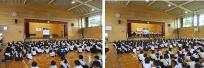 月曜日の2・3校時に3年生が第一小と交流学習を行いました。2校時は体育館での活動、3校時は各教室に分かれて道徳の授業を行いました。第一小の校長先生、教頭先生も見に来られていました。中学校に進学するとき、お互いに知り合った状態であるために、小学校同士が連携して、日常的に交流学習を行うことを大切にしています。