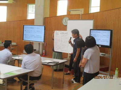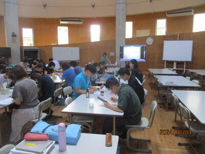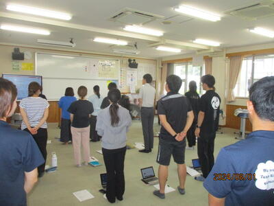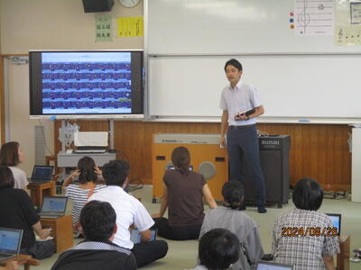 夏休みに、我々教職員が何をしてるのかというと校内、校外での研修や会議、事務整理、前期後半の授業準備など普段はじっくり時間をかけることができないようなことを行っています。写真は校内で実施した研修の様子です。水俣病問題について外部から講師を招いて学んだり、職員がそれぞれ得意な分野の授業を他の職員に伝えたり、新しく挿入されるアプリを学んだりしました。子どもたちが意欲を持って学び続けていくためには、私達も学び続ける必要があります。本校の良さの1つは、先生方に学び続ける意思があることです。