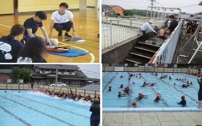 プールでの学習は、日常の生活空間と違うため楽しいさも増えますが、その分危険も増えると考えています。複数体制のでの指導、児童同士バディシステム等、安全に配慮することを第一に実施します。万が一の不測の事態に備えて、職員は毎年救急救命法を、学び続けています。