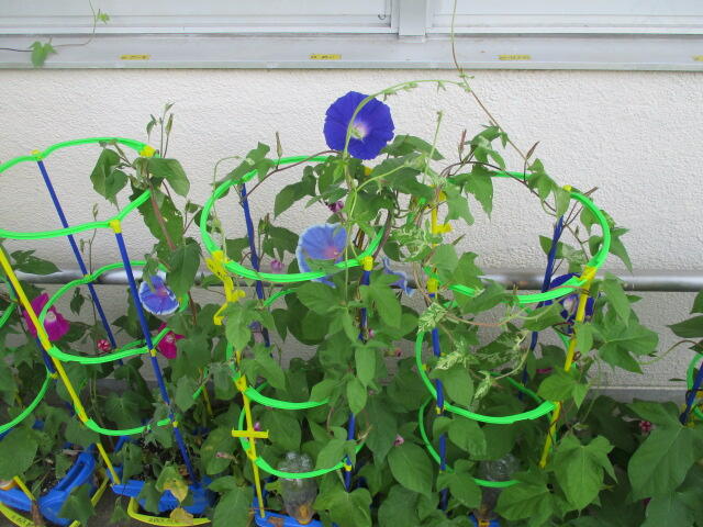 1年生教室のベランダ側には4月に種を植えた一人ひとりの植木鉢が並べられています。4月に種をまき、今立派に成長して花を咲かせています。4月からの子どもたちの成長と重なる部分があります。
