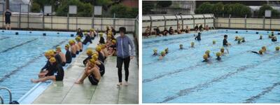 プールを使用しての授業は、陸上での運動と異なります。一番の違いは、呼吸が制限される運動であるということです。日常生活とは違う場所での活動になるため、万全の準備が必要になります。万が一の事が起きないように、プールでの授業は、必ず複複数体制で行います。また、緊急時に対応できるように、毎年研修を重ねながら授業を行っています。