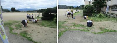 曇り空の日に、校庭の草取りを一生懸命に頑張っている姿がありました。無言で作業をしており、その様子見ていた私にも気づきませんでした。児童が衣装懸命な姿は、見ていて気持ちがいいですね。