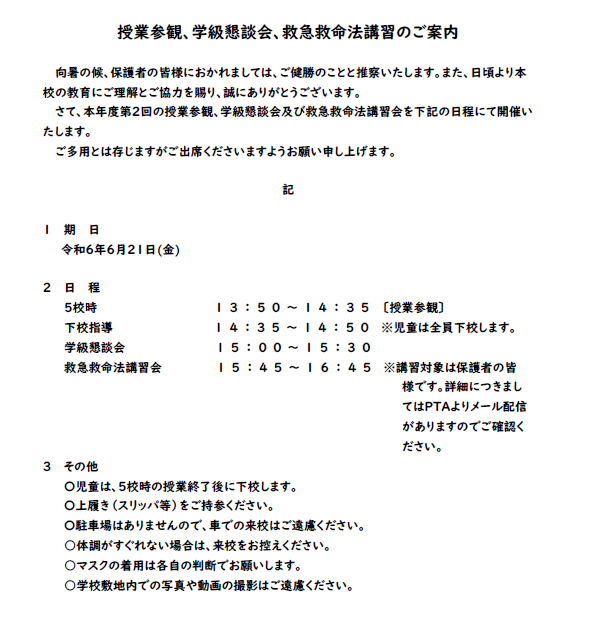 6月21日(金)は、授業参観、学級懇談会、救急救命法講習会です。5月31日付けで学校より各家庭に案内文を配付しております。ご多用とは存じますが、ご出席いただけますようお願い申し上げます。