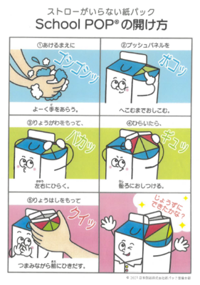 この度、容器の開封の仕方及び飲み方について、事前の周知をはかるために、別添の資料により、保護者の皆様にお知らせしますので、お子様と一緒に、ご確認していただくようお願いします。