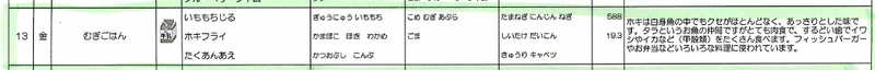 9月13日(金)の給食の献立が「むぎご飯、いももちじる、ホキフライ、たくあんあえ、牛乳」へ変更になりました。