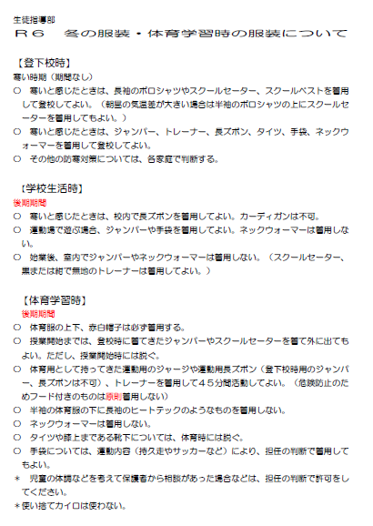 令和6年度西合志東小学校冬の服装についてのプリントを配付しました。