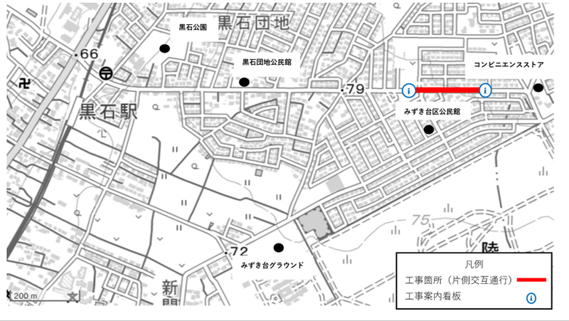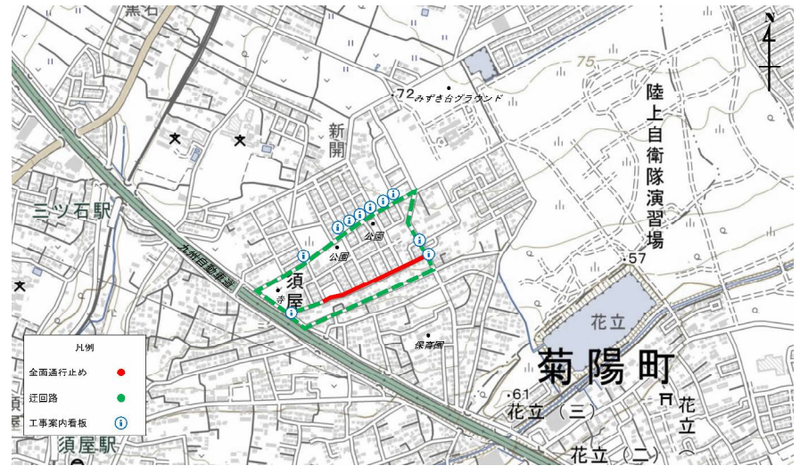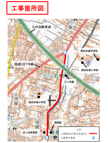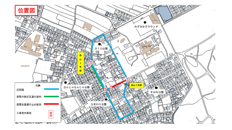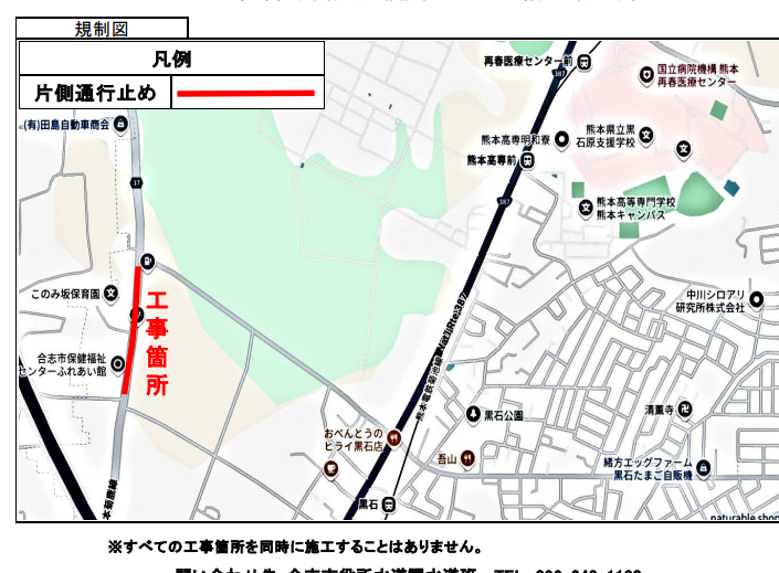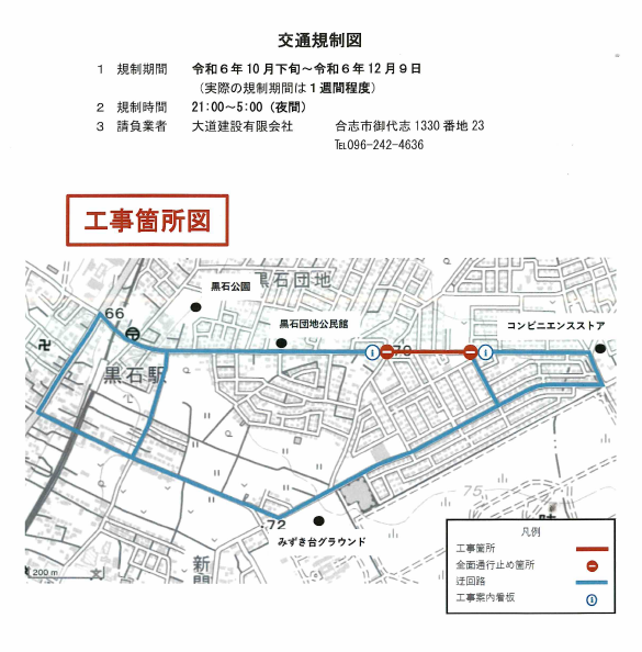 規制内容 昼間片側交互通行(9時~17時) 状況に応じて夜間片側交互通行、全面通行止め