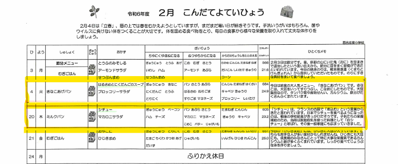 【変更前】4日 シチュー 、20日 春雨と肉団子のスープ