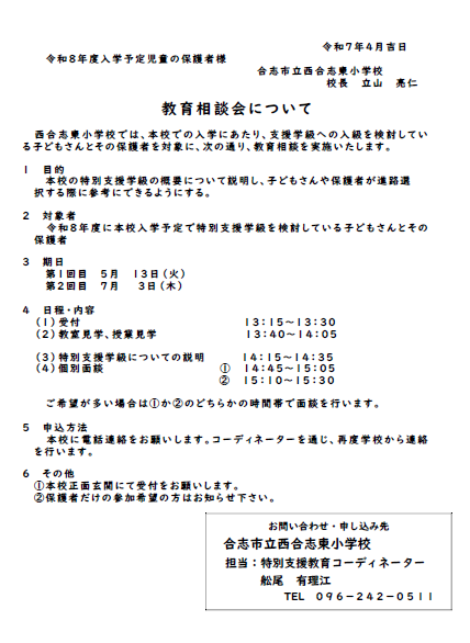 「西合志東小学校 緊急時引き渡しマニュアル 家庭常備用」を5月中旬にピンク色の紙に印刷し配付しております。内容を確認していただき、災害が発生したときはスムーズな引き渡しができるようにご協力お願いします。