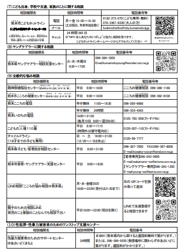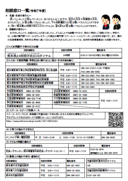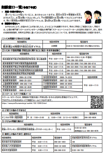 どの児童生徒も誰かに電話等で相談できる相談窓口の一覧を掲載しております。