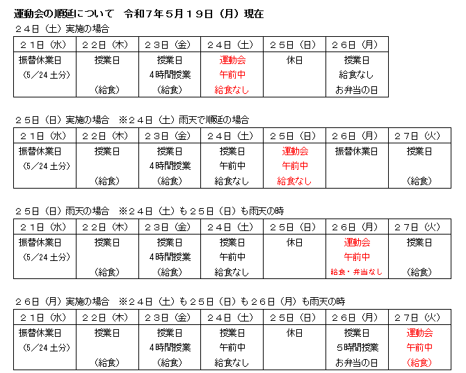 5月24日(土)運動会ですが、お天気が心配されます。運動会の順延について掲載しております。