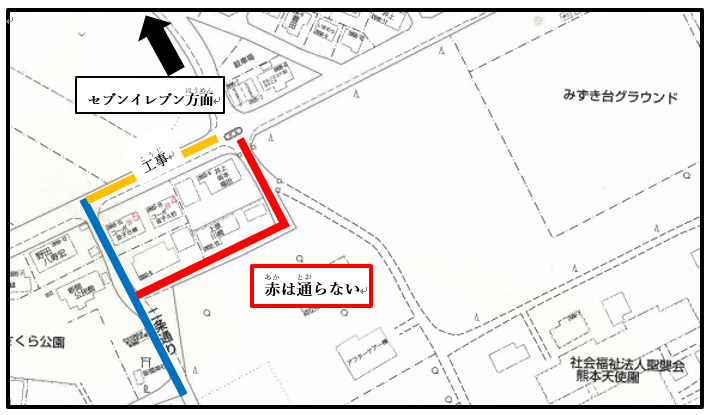 ※登下校で赤色のラインを通って登下校している児童もいるようです。赤色のラインは、工事中夜間は迂回路として使われるそうですが、登下校で使用できる道は、元々青色ラインと黄色ラインのみです。御家庭でも赤色ラインを通らないように指導をお願いします。