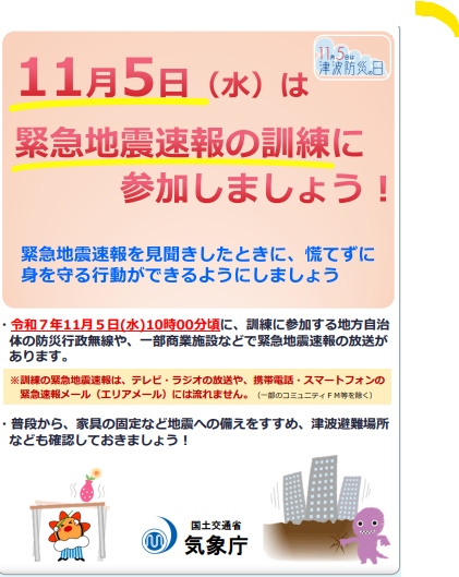 令和7年11月5日(水)に全国的に緊急地震速報の訓練が実施されます。