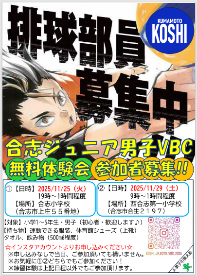 合志ジュニア男子バレーボールクラブから、部員募集及び体験会の案内チラシです。
