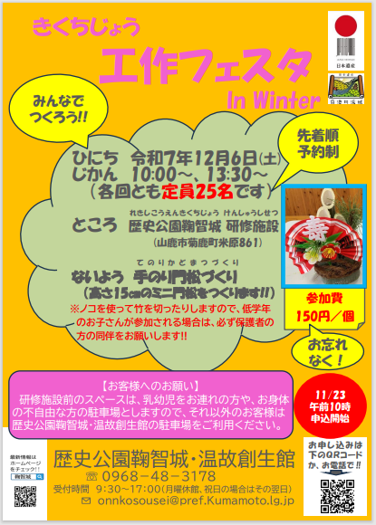 歴史公園鞠智城・温故創生館から「鞠智城工作フェスタ in Winter」の案内チラシが届きました。