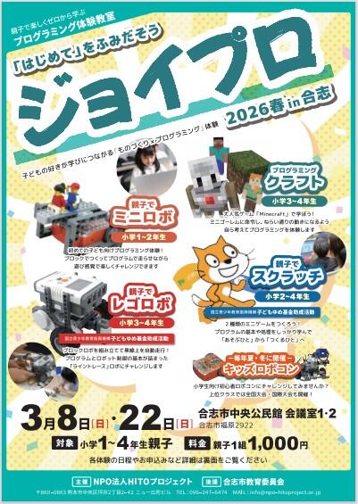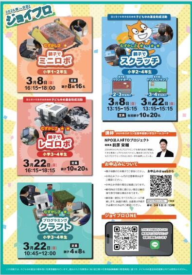 小学校1~4年生対象 親子プログラミング体験「ジョイプロ2026春in合志」の募集チラシが届きました。