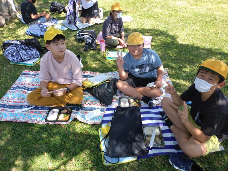 1年生は、生活科の「もっとあきをさがしにいこう」という授業で、新宮寺に出かけました。新宮寺では、和尚さんの話を聞いて、六観音を見せていただきました。新宮寺は、樹齢500年を越えるイチョウやモミジが色づいており、落ち葉を見つけて絵を描いたり、みんなで遊んだりしました。お昼は、コスモスやヒマワリを見ながら、みんなで楽しくお弁当を食べました。学校に戻ると、新宮寺で見つけた色がきれいな落ち葉を使ってお面作りをしました。子供たちも秋の楽しい思い出ができたようです。