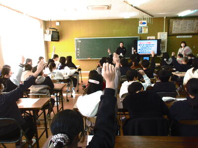 12月10日、錦町税務課から来校いただき、6年生を対象にした租税教室を行いました。その中で、「錦町は税金から一人何円の給食費(義務教育の9年間)を払っているでしょうか?」という質問をされました。その後、給食費一食515円(材料費・人件費・光熱費)、年間182回が9年間という数字を提示され、子供たちに計算させられました。正解の「84万円」に子供たちも驚いていました。最後の感想発表タイムで、宮原けいさんが「始めは税金はいらないと思っていたけど、税金があることで今の生活ができているし、税金は大切だと思いました。」と感想を発表しました。