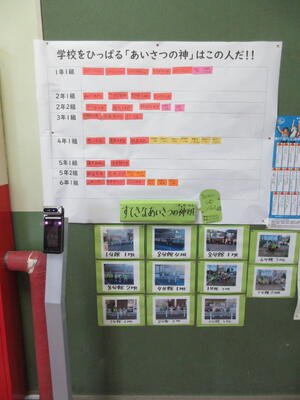 10月4日、児童玄関には「あいさつの神」と「あいさつの神班」が掲示されています。人権・生活委員会が「あいさつがまだまだ不十分である」という反省のもと、「会話につながるあいさつをしよう。」という取組を始めました。今朝も子供から「おはようございます。今日は、じめじめしていますね。」との挨拶を受けました。こういう取組に、積極的に参加する子供がいます。そして楽しんでいます。この「素直さ」は、人間力を伸ばす大きな能力です。逆に、やっていない人は、もったいない。「心が変われば人生が変わる。そして、心は1秒で変わることができる。」のです。あと、1週間の取組です。まずは、やってみる。そして、挨拶の取組をとことん楽しんでみる。すると、確実に自分の人間力が高まっていきます。「あいさつは、人なりです。」