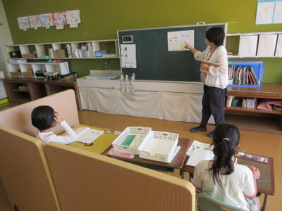 10月9日、ひまわり1で国語の研究授業を行いました。1年生は「うみのかくれんぼ」、2年生と3年生は途中までは「ことばのへんしん」をし、途中から2年生は「漢字とカタカナ」、3年生は「音読」の学習をしました。子供たちは、自分の課題にしっかりと取り組んでいました。本校で3つの学年の子供たちがいるクラスは唯一このひまわり1学級です。人数は5人ですが、3つの学習を同時に行うことは、本当に難しいです。支援員の先生方の協力も得ながら、効果的な「わたり学習」を含め、毎日が研究です。