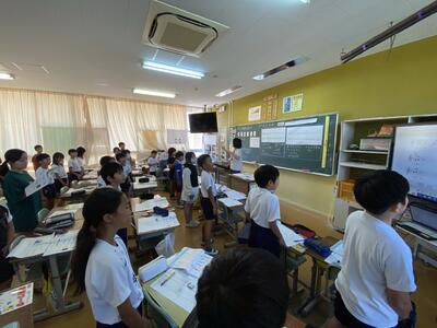 10月10日、3年1組で算数の研究授業を行いました。めあては「重さの計算の仕方を考えよう。」です。授業を参観し、一番感じたのが、「子供の目の輝き」と「挙手率の高さ」です。学級経営が土台にあるのは間違いないのですが、それ以外に担任の先生の次の2つの指導力の高さを感じました。1つ目は「確認」です。「立って、分かったら座る等の動きでの確認」「言える人?言えない人?の意思の確認」「〇〇さん~ですよ。と学習訓練の確認」「ペアの人との考えの確認」「友達の答えを見て回ってもいいよ。というマイサポートの確認」等子供たちの進捗状況をいろいろな方法で確認していました。もう1つは、「挑戦」です。1つ目の問題を解いて、その後、ハードルが高い2つ目の問題を出題するのです。「ん?どうすのる?」となります。挑戦意欲をくすぐるのです。「分からないことを学ぶこと」こそが授業です。しかも、「楽しく、意欲的に!」です。授業でも「元気と挑戦で成長」している3年生でした。