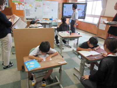 10月16日、5年1組で理科の研究授業を行いました。めあては「ものが水にとけることについて考えよう」でした。先生たちと共有したい点が、大きく2点。1つは「帯タイム」です。6つの単元について、パワーポイントで問題が作成してありました。理科専科の先生の手作り教材です。子供たちは、授業開始と同時に、2人1組でタブレットを開き、6分間じゃんじゃん問題に取り組みます。答え合わせも、すぐできるシステムになっています。「帯タイム」は復習の時間です。3分~5分程度ですが、今回のような効率的な復習の時間にしたいと思っています。