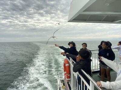 10月17日、修学旅行1日目がスタートしました。10時30分、フェリーかもめ号で、かっぱえびせんを指で直やり、最高5本!