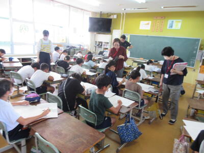 10月10日5校時、1年1組で担任と養護教諭による学級活動の研究授業を行いました。誘いにのらないことと体の大切なところを守る学習をしました。「いかのおすし」「とまとよ」の合言葉で安全について確認したり、養護教諭の先生の読み聞かせをじっと静かに聞き、プライベートゾーンを守るための服装を考えたりしました。ワークシートに考えた服装を描いて、その服装を選んだ理由を考えることができていました。