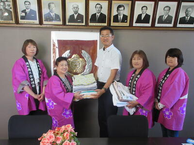 5月29日、錦町商工会女性部の皆様が4名来校され、たくさんの足ふきマットを寄贈していただきました。これから梅雨に入り、湿気で廊下等が滑りやすくなります。梅雨対策等に有効に使わせていただきます。まさに「学校の応援団」です。本当にありがとうございました。