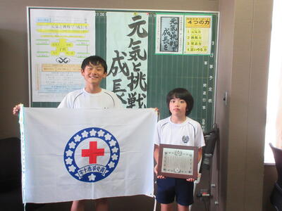 5月21日、環境ボランティア委員長と副委員長に、「銀色有功章の楯」と「表彰ペナント」を手渡しました。先週、熊本赤十字会館で行われた赤十字功労表彰式に出席し、いただいてきたものです。西小学校は、赤十字に登録して15年目になります。環境ボランティア委員会を中心に、「ワクチンを届けようキャンペーン」「赤い羽根共同募金」「書き損じはがき」「勤労生産活動(花栽培やイモ栽培)」「美化作業」等に取り組み続けています。「思いやる力」を育む大切な取組になっています。