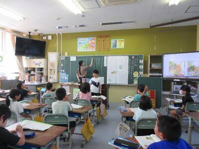 10月16日、5年1組で理科の研究授業を行いました。めあては「ものが水にとけることについて考えよう」でした。先生たちと共有したい点が、大きく2点。1つは「帯タイム」です。6つの単元について、パワーポイントで問題が作成してありました。理科専科の先生の手作り教材です。子供たちは、授業開始と同時に、2人1組でタブレットを開き、6分間じゃんじゃん問題に取り組みます。答え合わせも、すぐできるシステムになっています。「帯タイム」は復習の時間です。3分~5分程度ですが、今回のような効率的な復習の時間にしたいと思っています。