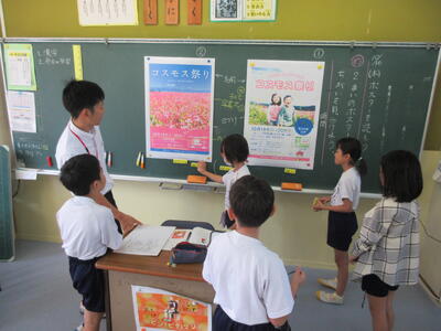 10月10日、たんぽぽ2教室で国語の研究授業を行いました。めあては「2枚のポスターの違いについて考えよう」で、主発問が「どちらのポスターがお祭りに行きたくなりますか。」でした。下の写真は、5人が名前シールを貼り終えた写真です。右のポスターが2人、左のポスターが2人、まだ迷っているが1名でした。この後理由をペアや全体で出し合いました。その理由を聞いて、途中で考えが変わった子供が2名いました。考えが変わることも、素敵なことです。二者択一の問題は、考えが分かれることが多く、友達の理由を聞くことによって、自分の考えと友達の考えを比較検討し、新たな考えを生んだり、理由に重みが増したりします。まさに、「比較検討の学び」は、脳が2倍汗をかく学習活動です。参観していて45分があっという間でした。